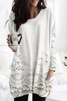 The Breeze in Flower Tunic blends cozy comfort with delicate details—perfect for relaxed mornings, coffee dates, or simply unwinding in style. Designed to flow naturally with your body, it adds a soft touch of elegance to your everyday life. Featuring intricate lace-like embroidery along the hem and sleeves, a relaxed dropped-shoulder fit, and luxuriously soft fabric, this tunic makes staying comfortable look effortlessly chic.